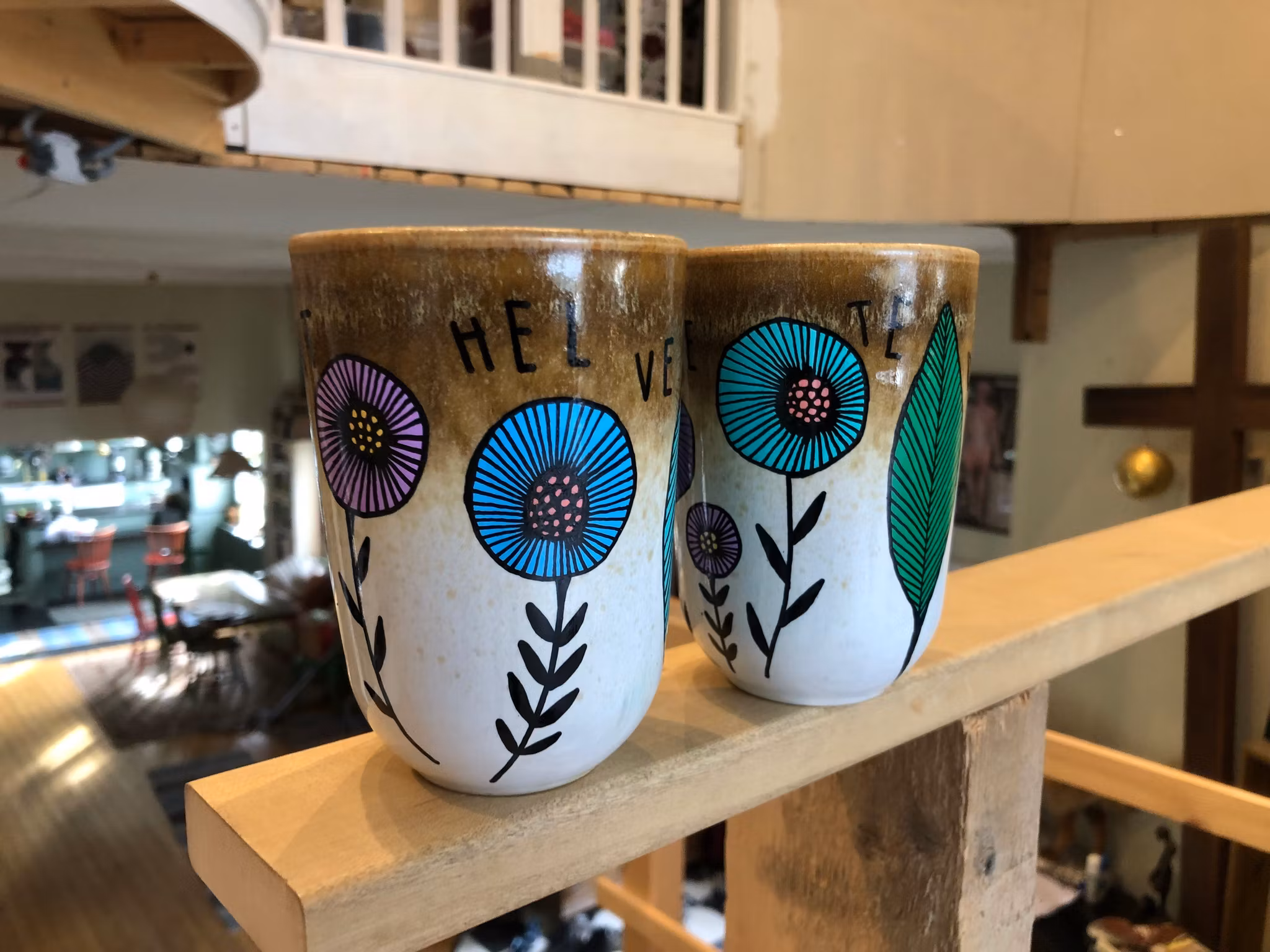 DRA ÅT HELVE-TE (2 st) I lager. Antal: 1 700 kr LÄGG I KORGEN Handmålade muggar med texten DRA ÅT HELVE-TE. Diskas för hand! EJ i diskmaskin! 2 stycken!