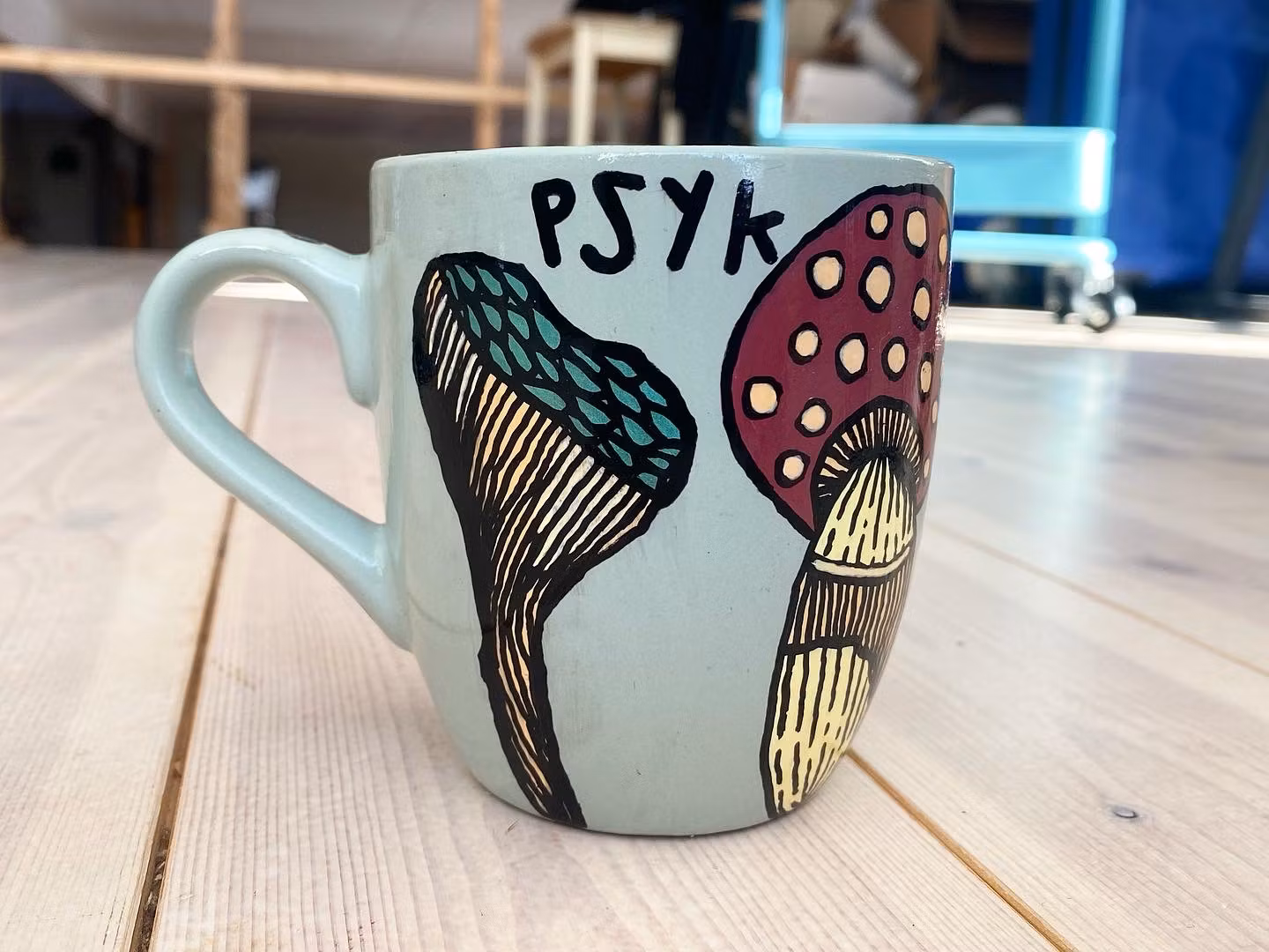 PSYKBRYT SVAMP TURKOS 350 kr Produkten är tyvärr slut i lager. :( Handmålad mugg med texten ”PSYKBRYT BABY”. Bör handdiskas.