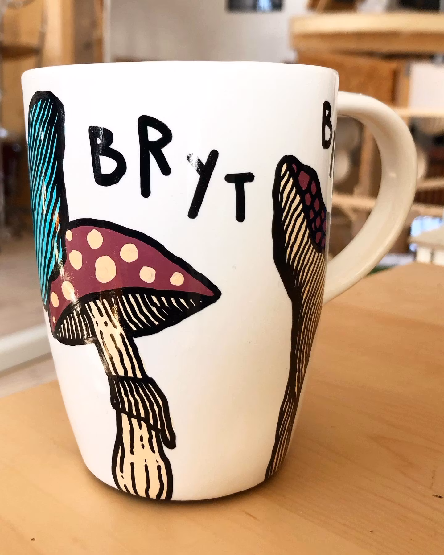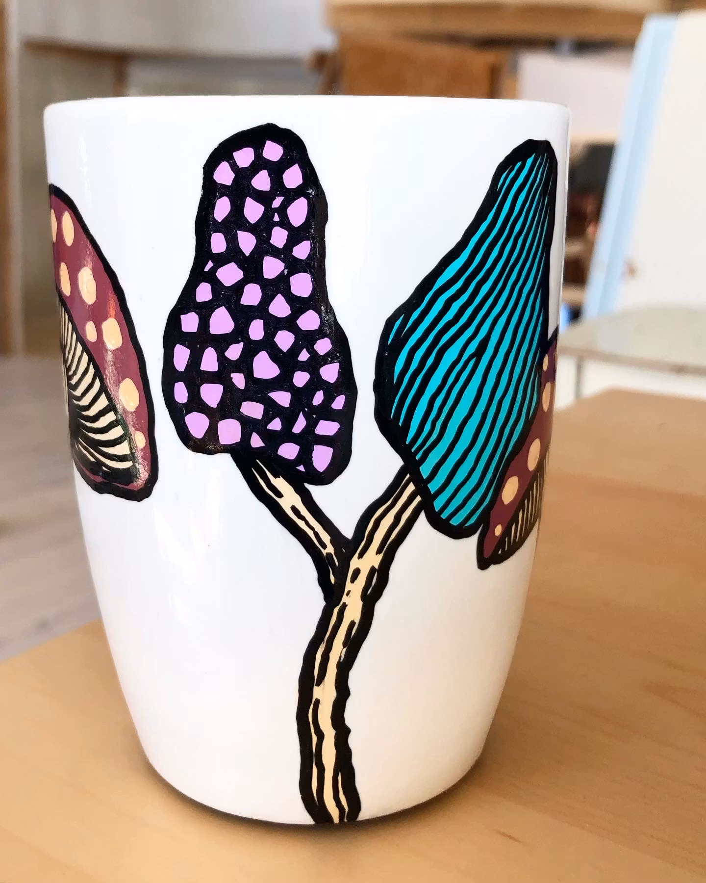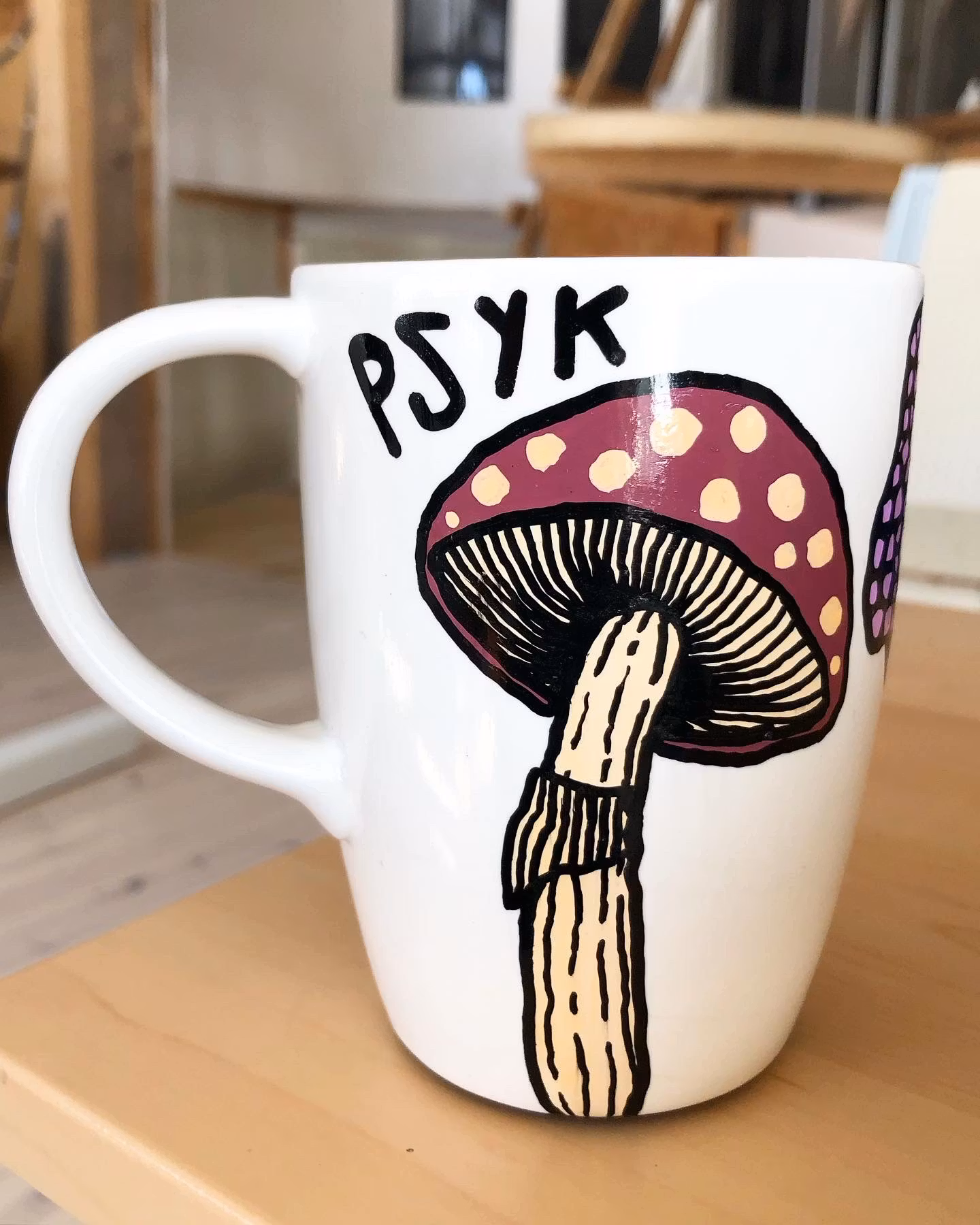 PSYKBRYT SVAMPAR 350 kr Produkten är tyvärr slut i lager. :( En större mugg med stort öra från sagaform. Handmålad. Bör handdiskas. Den är lackad så de kan spegla sig lite på fotona.