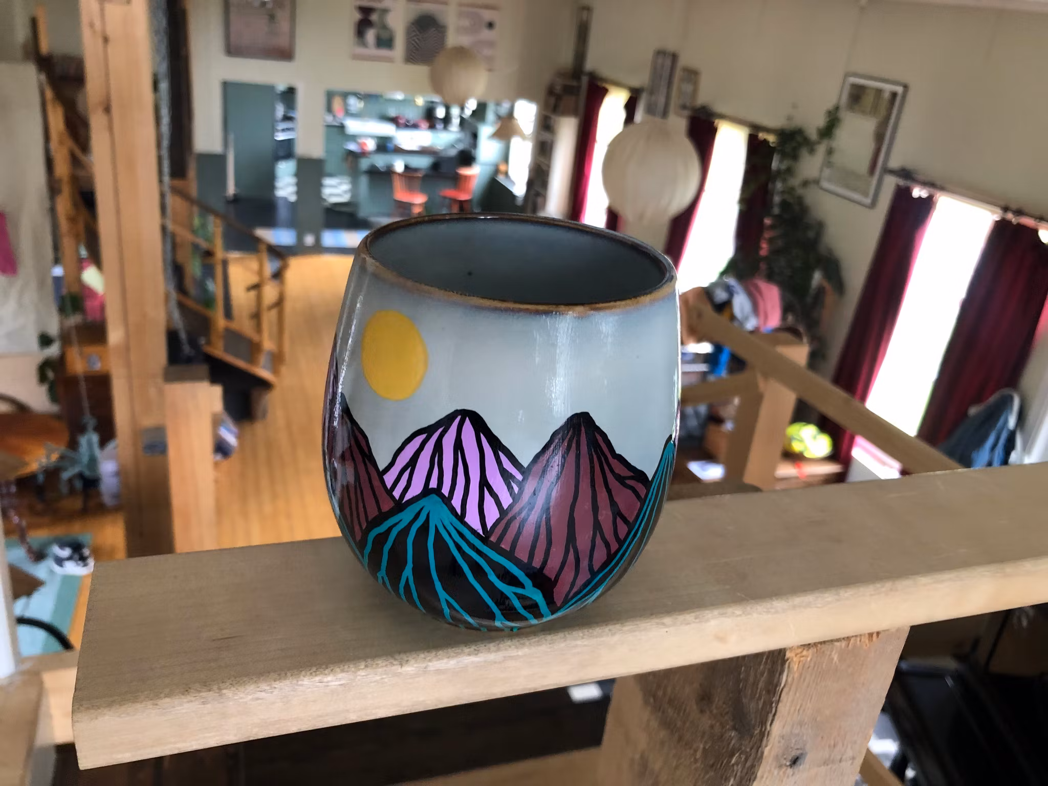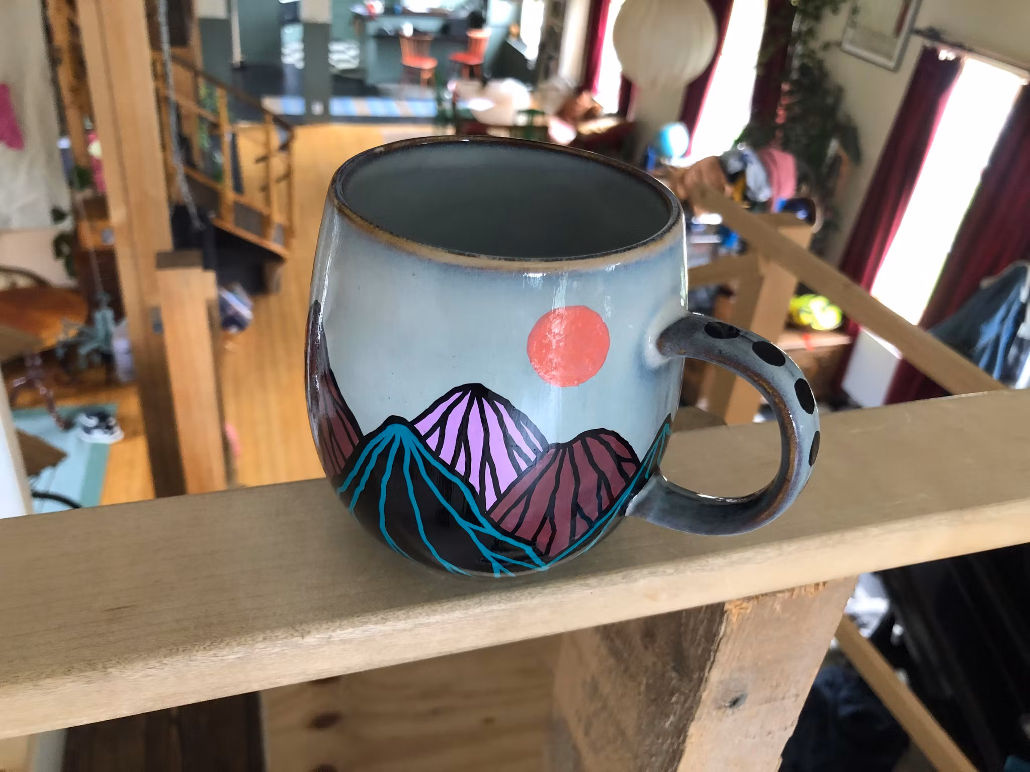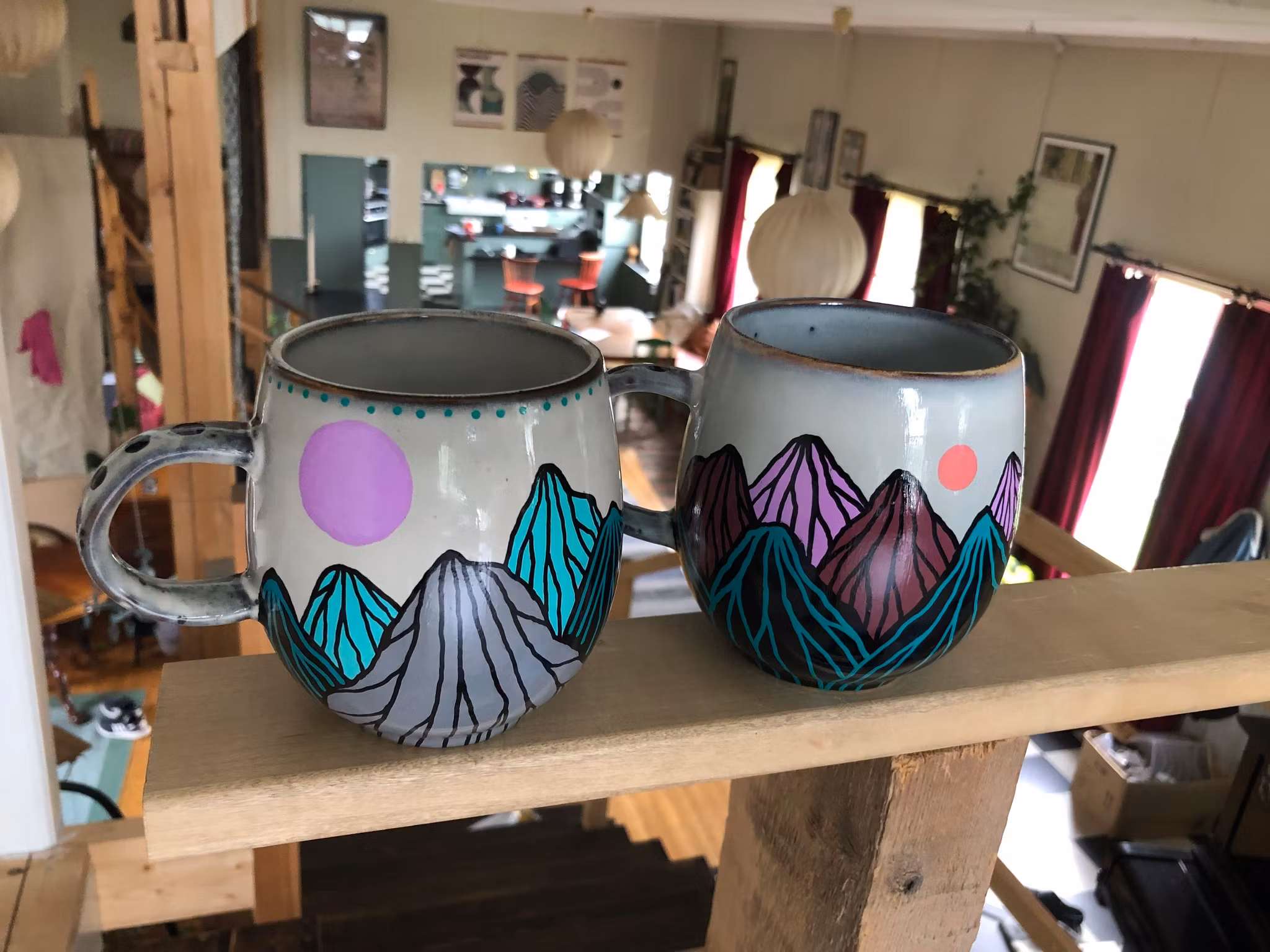 THREE MOONS - rosaröd 420 kr Produkten är tyvärr slut i lager. :( Handmålad (stor) mugg med bergslandskap och tre månar. Bör ej diskas i maskin.