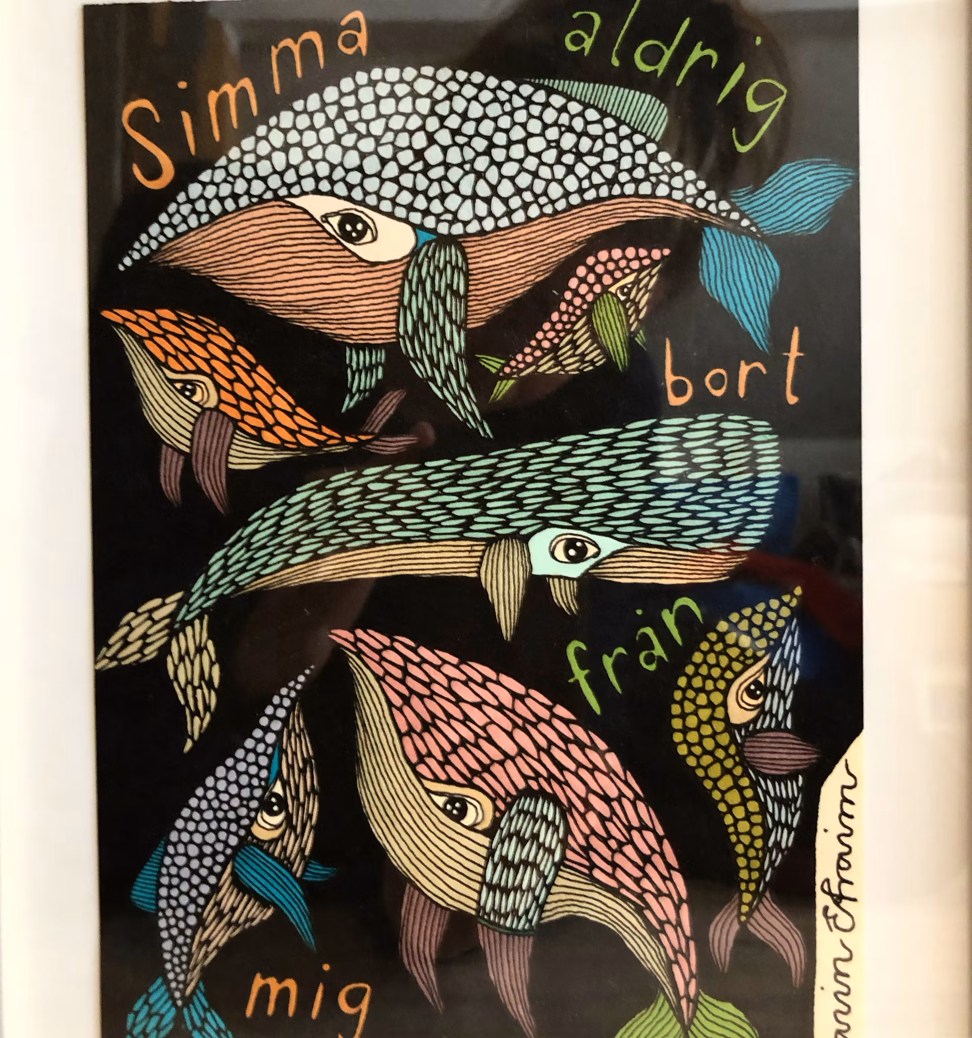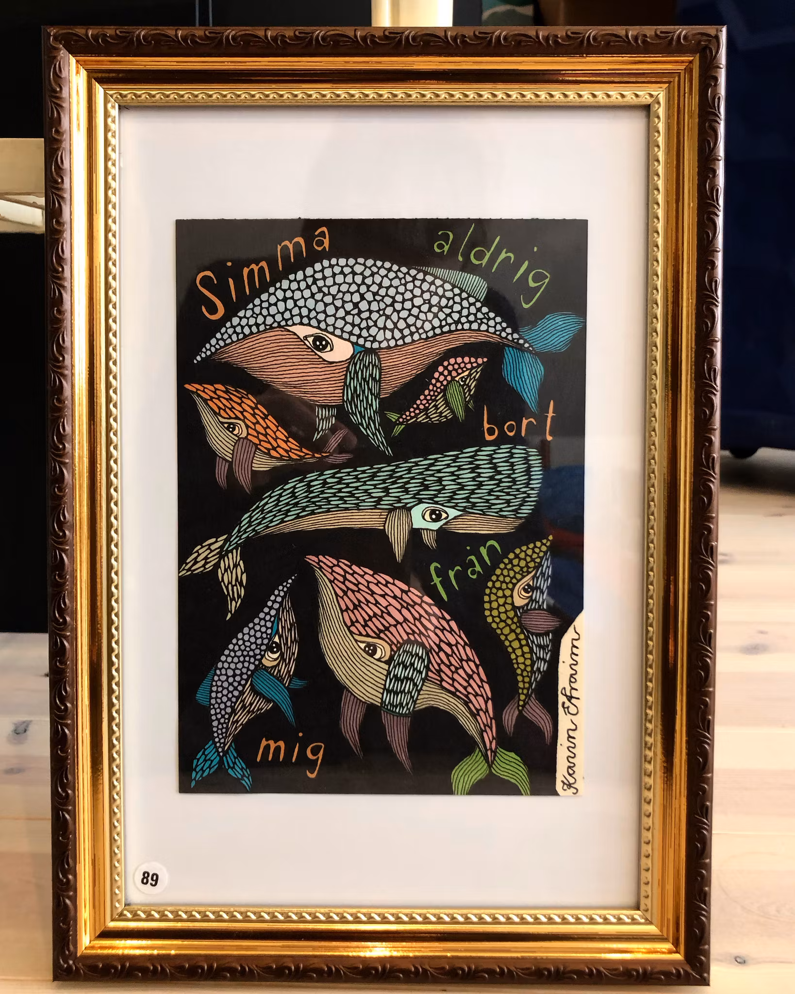 SIMMA ALDRIG BORT FRÅN MIG 3 600 kr Produkten är tyvärr slut i lager. :( Originalet till ”Simma aldrig bort från mig”. Guldram. Motivet är i A5 och med ram är den större. Fotot kan vara något otydligt eftersom glaset på ramen speglar.