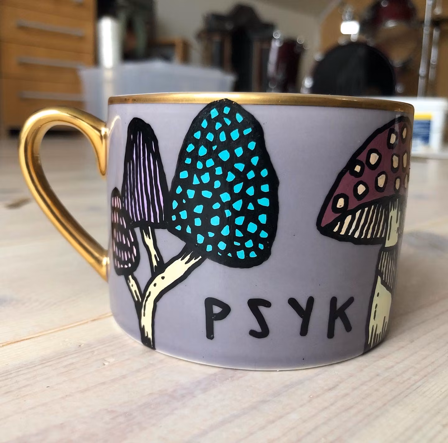PSYKBRYT 450 kr Produkten är tyvärr slut i lager. :( Psykbryt med svampar. Lila kopp med guldhandtag. Bör diskas för hand eftersom den är handmålad.