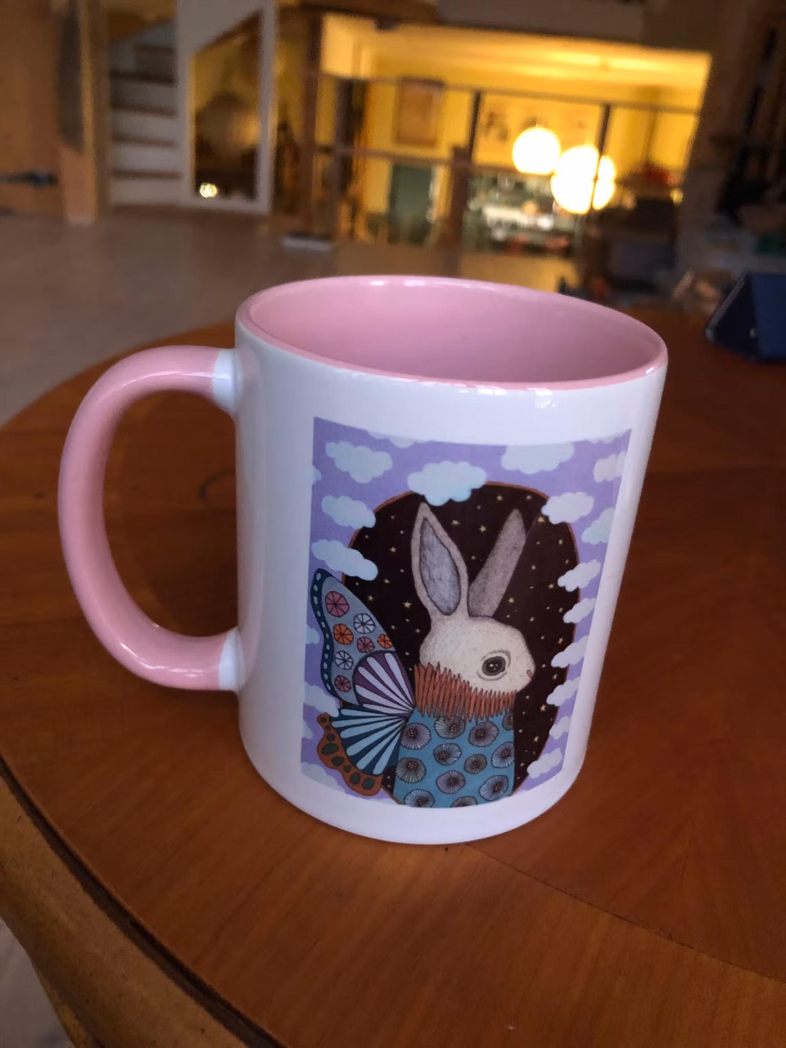 Mugg i keramik med kanin. Rosa handtag och insida.
